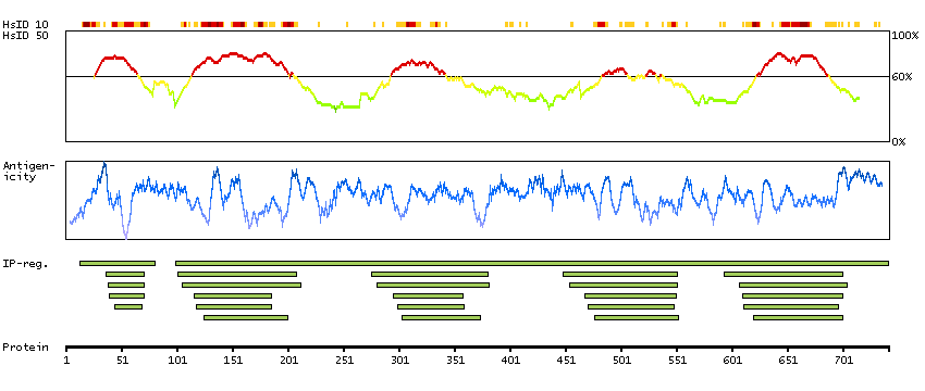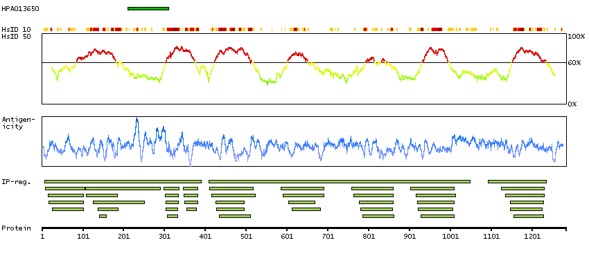 Under the antigens, the maximum percent sequence identity of the protein to all other proteins from other human genes is displayed, using a sliding window of 10 aa residues (HsID 10) or 50 aa residues (HsID 50). The region with the lowest possible identity is always selected for antigen design, with a maximum identity of 60% allowed for designing a single-target antigen (read more).