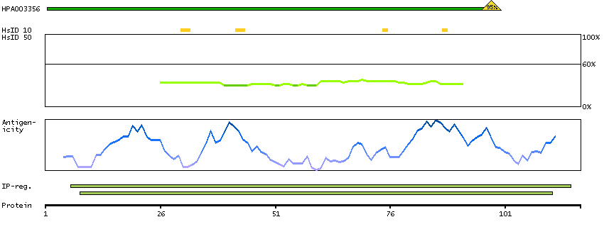 Under the antigens, the maximum percent sequence identity of the protein to all other proteins from other human genes is displayed, using a sliding window of 10 aa residues (HsID 10) or 50 aa residues (HsID 50). The region with the lowest possible identity is always selected for antigen design, with a maximum identity of 60% allowed for designing a single-target antigen (read more).