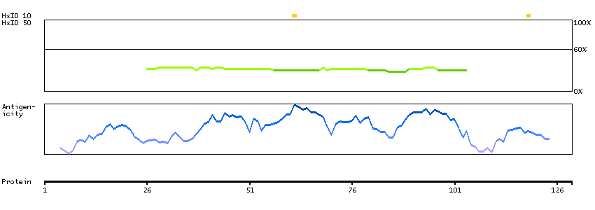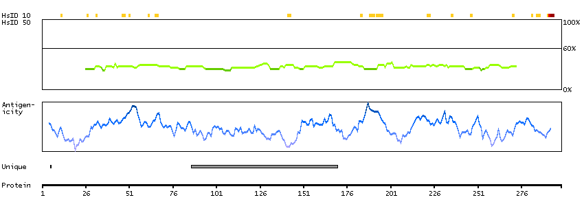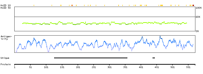 Under the antigens, the maximum percent sequence identity of the protein to all other proteins from other human genes is displayed, using a sliding window of 10 aa residues (HsID 10) or 50 aa residues (HsID 50). The region with the lowest possible identity is always selected for antigen design, with a maximum identity of 60% allowed for designing a single-target antigen (read more).