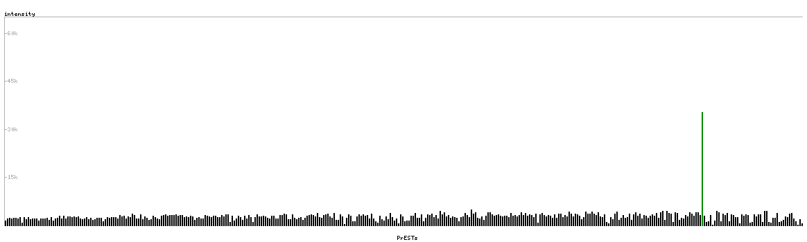 At the top of the view, the position of the antigen (identified by the corresponding HPA identifier) is shown as a green bar. A yellow triangle on the bar indicates a <100% sequence identity to the protein target.