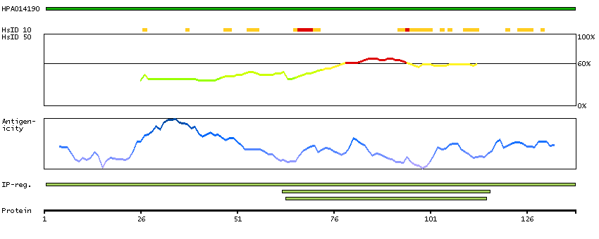 Under the antigens, the maximum percent sequence identity of the protein to all other proteins from other human genes is displayed, using a sliding window of 10 aa residues (HsID 10) or 50 aa residues (HsID 50). The region with the lowest possible identity is always selected for antigen design, with a maximum identity of 60% allowed for designing a single-target antigen (read more).