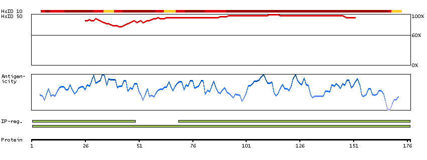 Under the antigens, the maximum percent sequence identity of the protein to all other proteins from other human genes is displayed, using a sliding window of 10 aa residues (HsID 10) or 50 aa residues (HsID 50). The region with the lowest possible identity is always selected for antigen design, with a maximum identity of 60% allowed for designing a single-target antigen (read more).