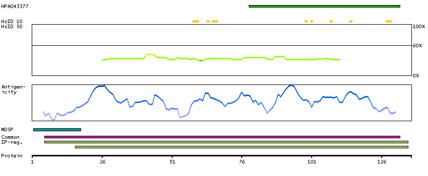 Under the antigens, the maximum percent sequence identity of the protein to all other proteins from other human genes is displayed, using a sliding window of 10 aa residues (HsID 10) or 50 aa residues (HsID 50). The region with the lowest possible identity is always selected for antigen design, with a maximum identity of 60% allowed for designing a single-target antigen (read more).