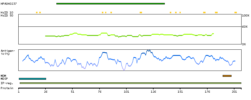 Under the antigens, the maximum percent sequence identity of the protein to all other proteins from other human genes is displayed, using a sliding window of 10 aa residues (HsID 10) or 50 aa residues (HsID 50). The region with the lowest possible identity is always selected for antigen design, with a maximum identity of 60% allowed for designing a single-target antigen (read more).