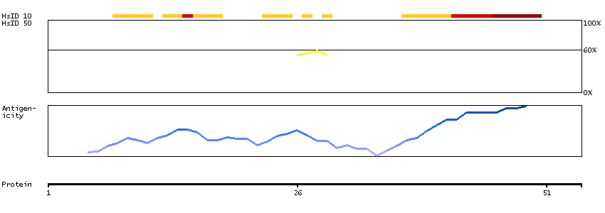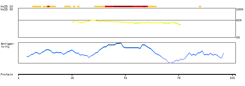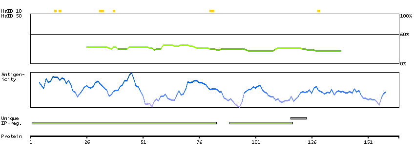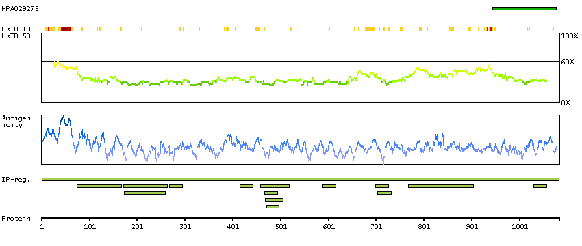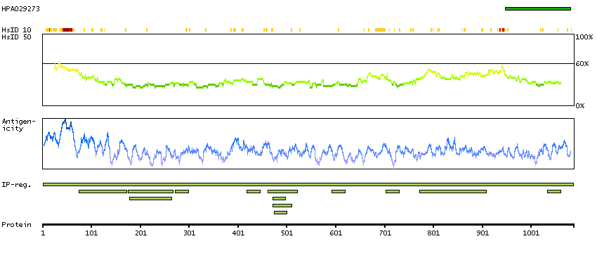 Under the antigens, the maximum percent sequence identity of the protein to all other proteins from other human genes is displayed, using a sliding window of 10 aa residues (HsID 10) or 50 aa residues (HsID 50). The region with the lowest possible identity is always selected for antigen design, with a maximum identity of 60% allowed for designing a single-target antigen (read more).