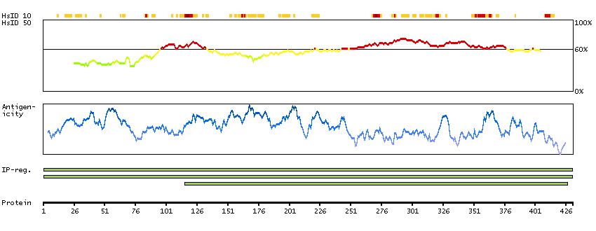 Under the antigens, the maximum percent sequence identity of the protein to all other proteins from other human genes is displayed, using a sliding window of 10 aa residues (HsID 10) or 50 aa residues (HsID 50). The region with the lowest possible identity is always selected for antigen design, with a maximum identity of 60% allowed for designing a single-target antigen (read more).