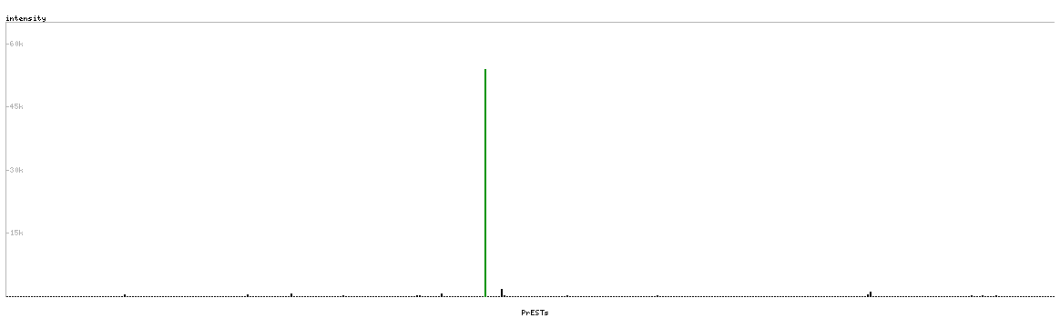 At the top of the view, the position of the antigen (identified by the corresponding HPA identifier) is shown as a green bar. A yellow triangle on the bar indicates a <100% sequence identity to the protein target.