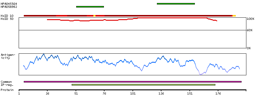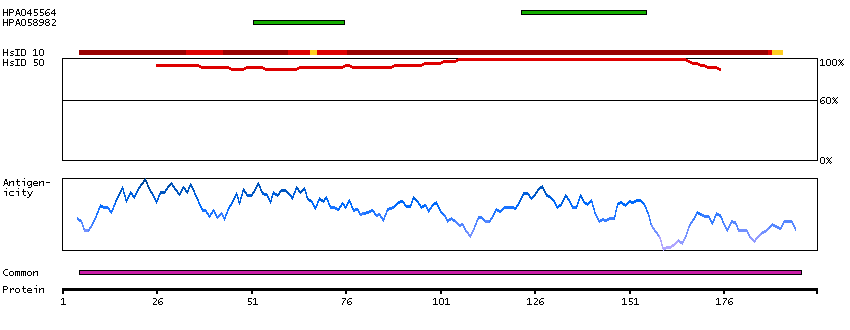 Under the antigens, the maximum percent sequence identity of the protein to all other proteins from other human genes is displayed, using a sliding window of 10 aa residues (HsID 10) or 50 aa residues (HsID 50). The region with the lowest possible identity is always selected for antigen design, with a maximum identity of 60% allowed for designing a single-target antigen (read more).