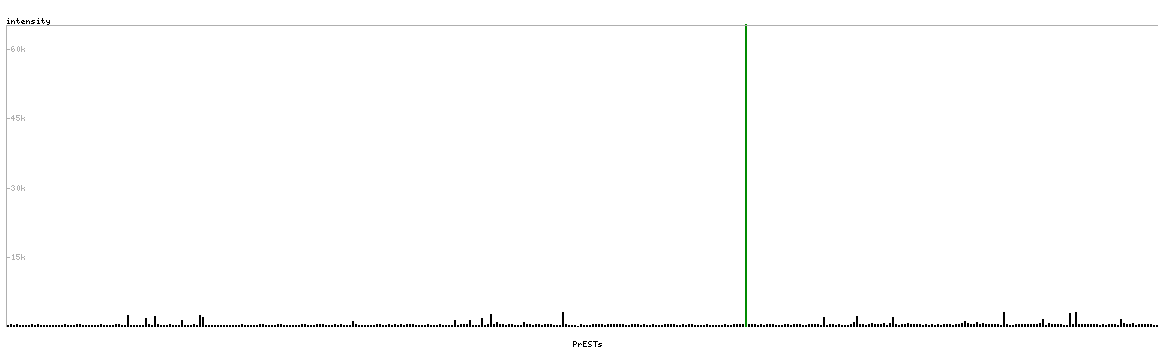 At the top of the view, the position of the antigen (identified by the corresponding HPA identifier) is shown as a green bar. A yellow triangle on the bar indicates a <100% sequence identity to the protein target.