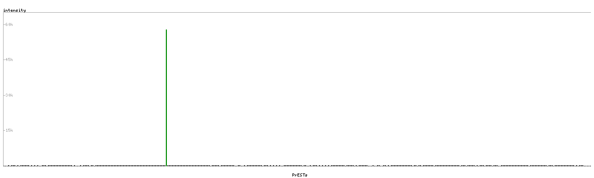 At the top of the view, the position of the antigen (identified by the corresponding HPA identifier) is shown as a green bar. A yellow triangle on the bar indicates a <100% sequence identity to the protein target.