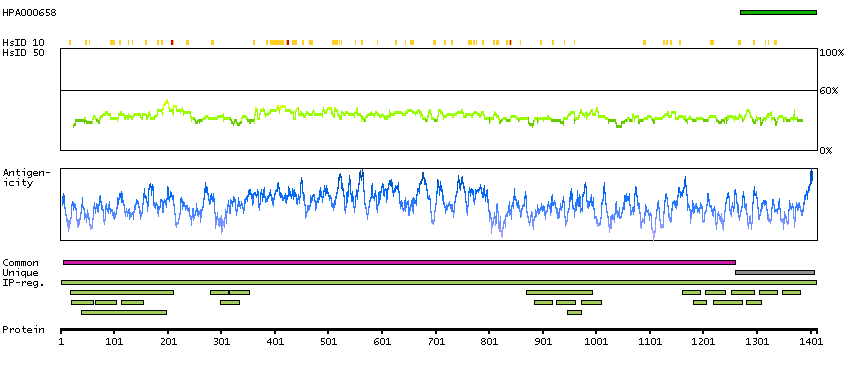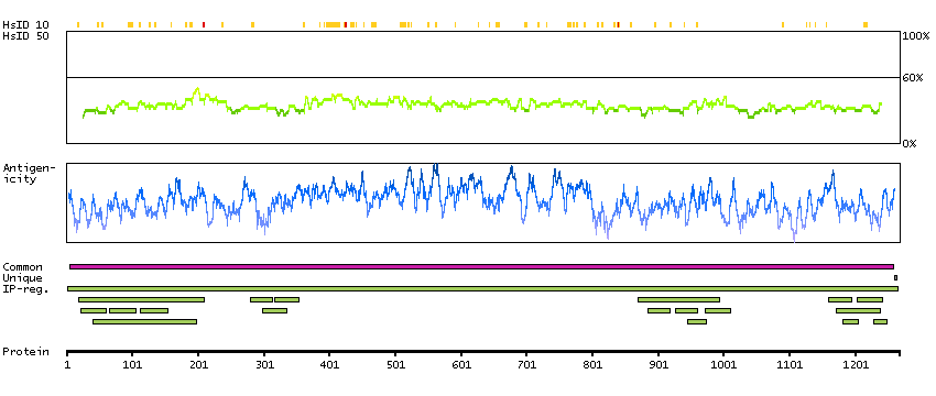 Under the antigens, the maximum percent sequence identity of the protein to all other proteins from other human genes is displayed, using a sliding window of 10 aa residues (HsID 10) or 50 aa residues (HsID 50). The region with the lowest possible identity is always selected for antigen design, with a maximum identity of 60% allowed for designing a single-target antigen (read more).