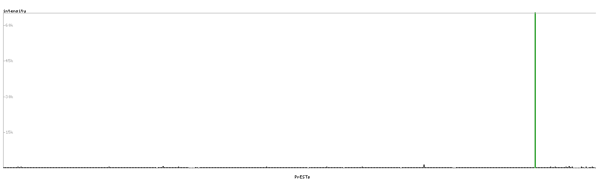 At the top of the view, the position of the antigen (identified by the corresponding HPA identifier) is shown as a green bar. A yellow triangle on the bar indicates a <100% sequence identity to the protein target.