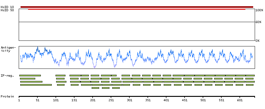 Under the antigens, the maximum percent sequence identity of the protein to all other proteins from other human genes is displayed, using a sliding window of 10 aa residues (HsID 10) or 50 aa residues (HsID 50). The region with the lowest possible identity is always selected for antigen design, with a maximum identity of 60% allowed for designing a single-target antigen (read more).