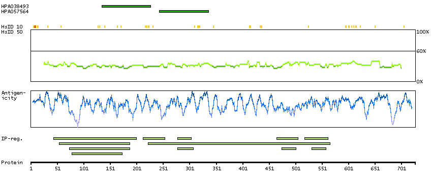 Under the antigens, the maximum percent sequence identity of the protein to all other proteins from other human genes is displayed, using a sliding window of 10 aa residues (HsID 10) or 50 aa residues (HsID 50). The region with the lowest possible identity is always selected for antigen design, with a maximum identity of 60% allowed for designing a single-target antigen (read more).