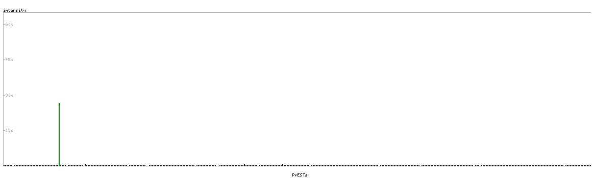 At the top of the view, the position of the antigen (identified by the corresponding HPA identifier) is shown as a green bar. A yellow triangle on the bar indicates a <100% sequence identity to the protein target.