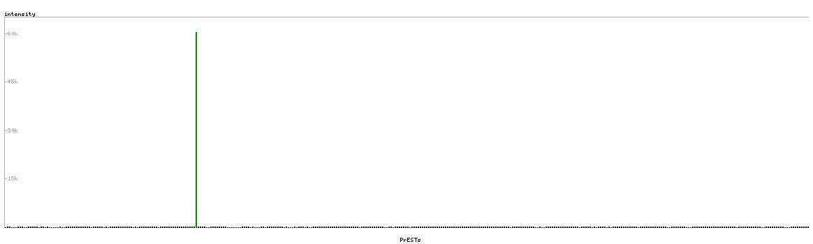 At the top of the view, the position of the antigen (identified by the corresponding HPA identifier) is shown as a green bar. A yellow triangle on the bar indicates a <100% sequence identity to the protein target.