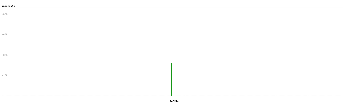 At the top of the view, the position of the antigen (identified by the corresponding HPA identifier) is shown as a green bar. A yellow triangle on the bar indicates a <100% sequence identity to the protein target.