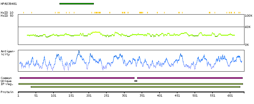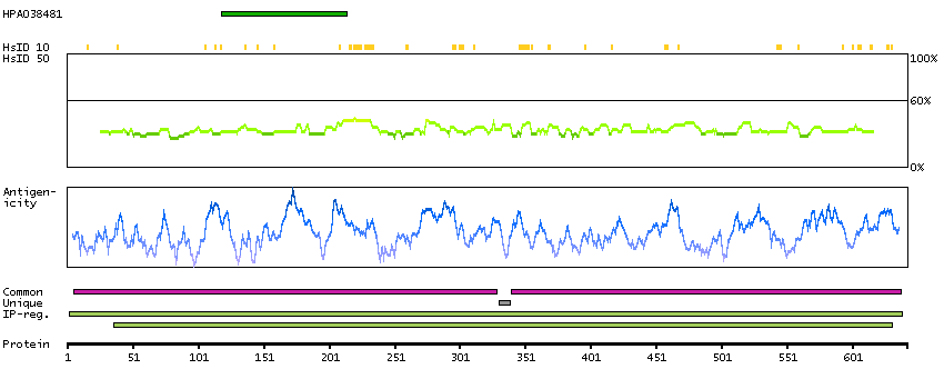 Under the antigens, the maximum percent sequence identity of the protein to all other proteins from other human genes is displayed, using a sliding window of 10 aa residues (HsID 10) or 50 aa residues (HsID 50). The region with the lowest possible identity is always selected for antigen design, with a maximum identity of 60% allowed for designing a single-target antigen (read more).