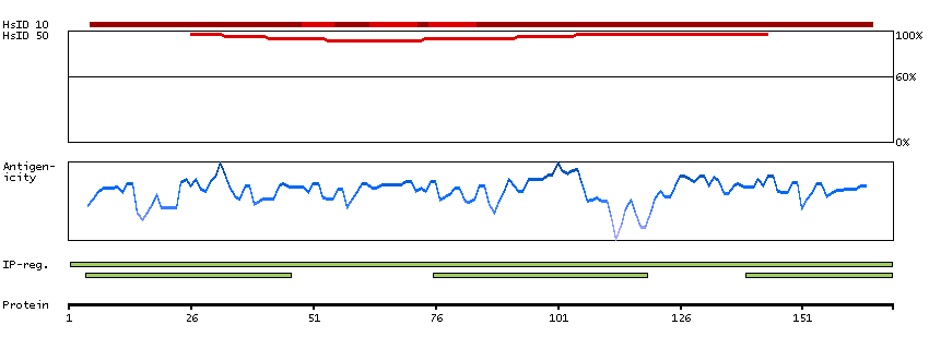 Under the antigens, the maximum percent sequence identity of the protein to all other proteins from other human genes is displayed, using a sliding window of 10 aa residues (HsID 10) or 50 aa residues (HsID 50). The region with the lowest possible identity is always selected for antigen design, with a maximum identity of 60% allowed for designing a single-target antigen (read more).