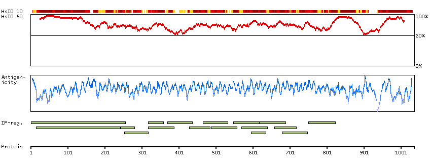 Under the antigens, the maximum percent sequence identity of the protein to all other proteins from other human genes is displayed, using a sliding window of 10 aa residues (HsID 10) or 50 aa residues (HsID 50). The region with the lowest possible identity is always selected for antigen design, with a maximum identity of 60% allowed for designing a single-target antigen (read more).