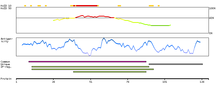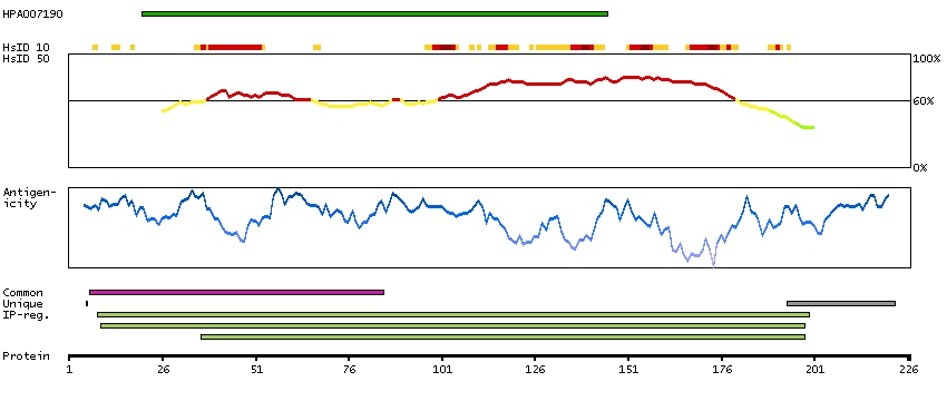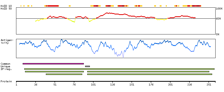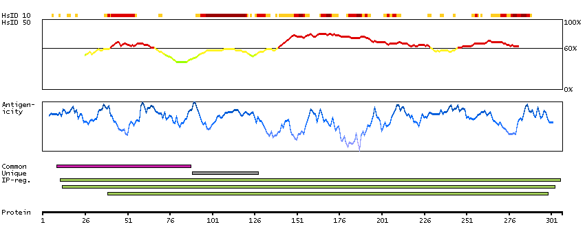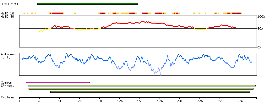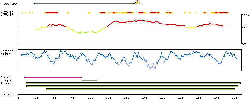 Under the antigens, the maximum percent sequence identity of the protein to all other proteins from other human genes is displayed, using a sliding window of 10 aa residues (HsID 10) or 50 aa residues (HsID 50). The region with the lowest possible identity is always selected for antigen design, with a maximum identity of 60% allowed for designing a single-target antigen (read more).