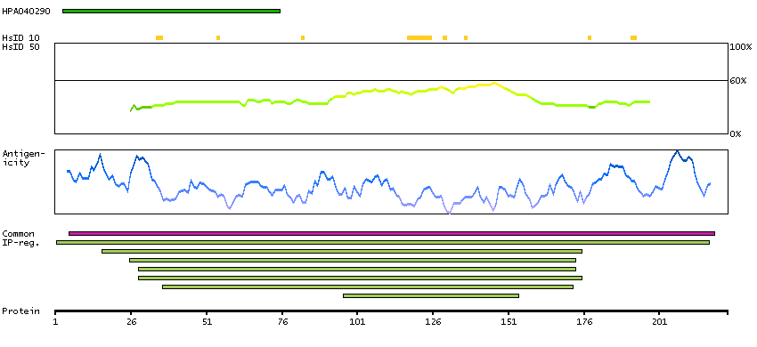 Under the antigens, the maximum percent sequence identity of the protein to all other proteins from other human genes is displayed, using a sliding window of 10 aa residues (HsID 10) or 50 aa residues (HsID 50). The region with the lowest possible identity is always selected for antigen design, with a maximum identity of 60% allowed for designing a single-target antigen (read more).