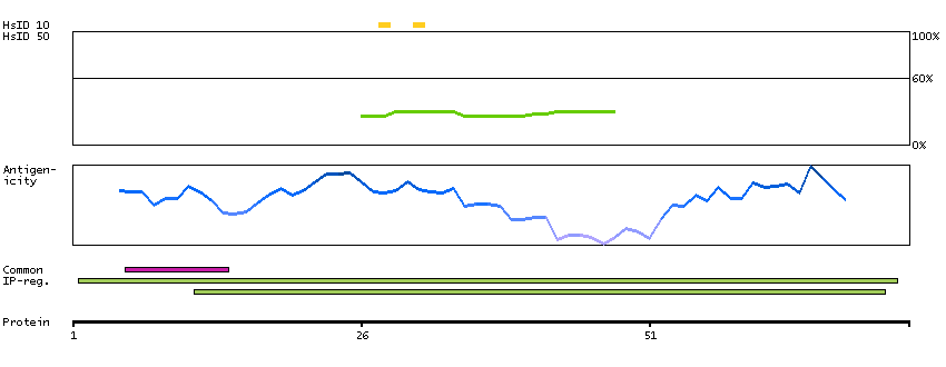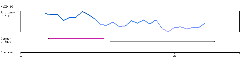Under the antigens, the maximum percent sequence identity of the protein to all other proteins from other human genes is displayed, using a sliding window of 10 aa residues (HsID 10) or 50 aa residues (HsID 50). The region with the lowest possible identity is always selected for antigen design, with a maximum identity of 60% allowed for designing a single-target antigen (read more).