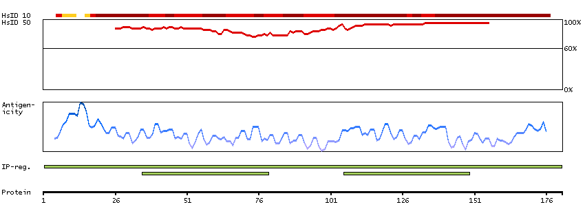 Under the antigens, the maximum percent sequence identity of the protein to all other proteins from other human genes is displayed, using a sliding window of 10 aa residues (HsID 10) or 50 aa residues (HsID 50). The region with the lowest possible identity is always selected for antigen design, with a maximum identity of 60% allowed for designing a single-target antigen (read more).