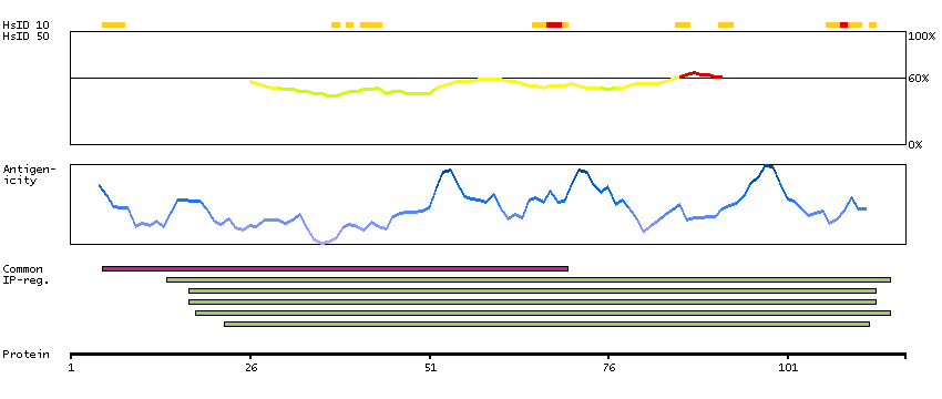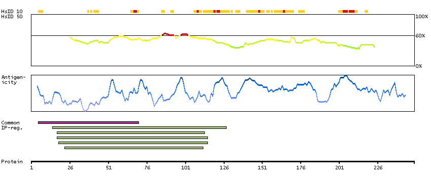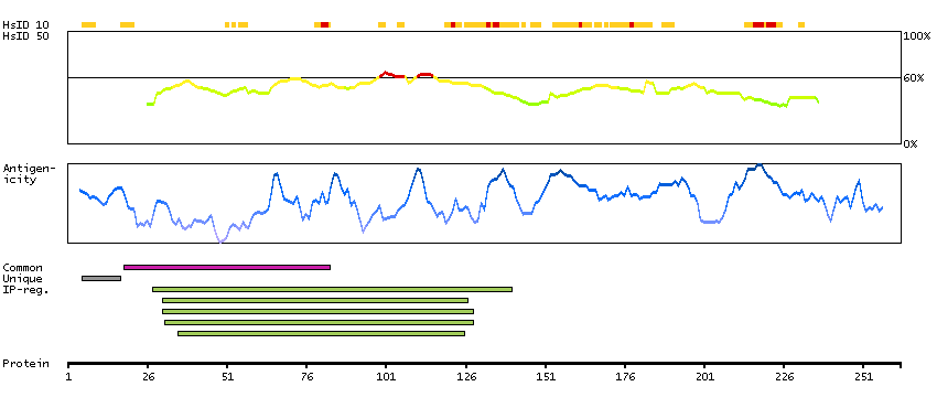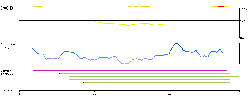 Under the antigens, the maximum percent sequence identity of the protein to all other proteins from other human genes is displayed, using a sliding window of 10 aa residues (HsID 10) or 50 aa residues (HsID 50). The region with the lowest possible identity is always selected for antigen design, with a maximum identity of 60% allowed for designing a single-target antigen (read more).