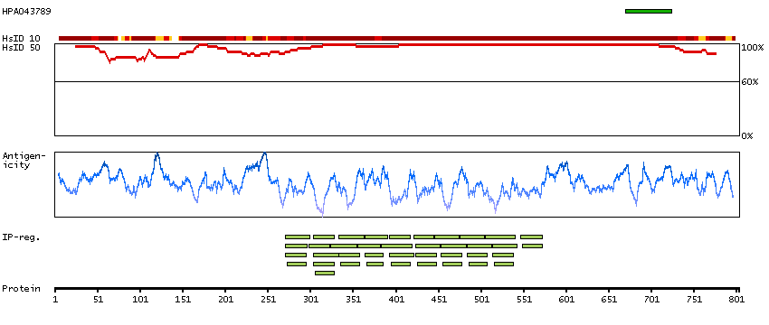 Under the antigens, the maximum percent sequence identity of the protein to all other proteins from other human genes is displayed, using a sliding window of 10 aa residues (HsID 10) or 50 aa residues (HsID 50). The region with the lowest possible identity is always selected for antigen design, with a maximum identity of 60% allowed for designing a single-target antigen (read more).