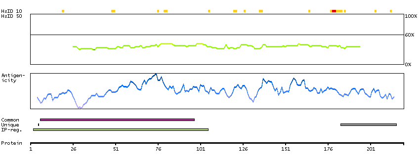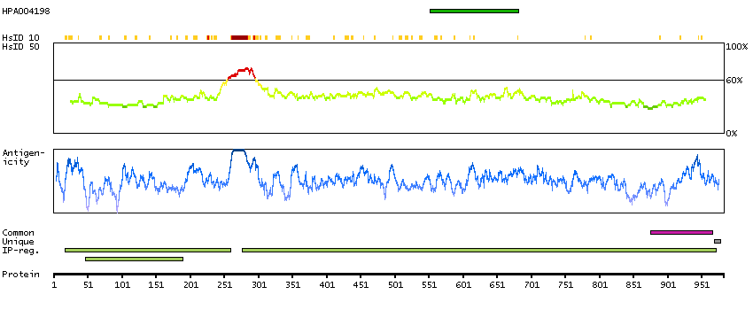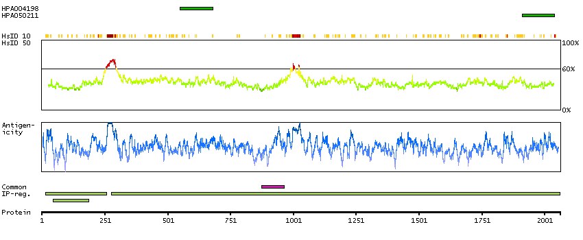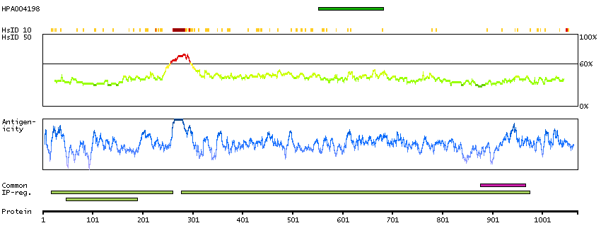 Under the antigens, the maximum percent sequence identity of the protein to all other proteins from other human genes is displayed, using a sliding window of 10 aa residues (HsID 10) or 50 aa residues (HsID 50). The region with the lowest possible identity is always selected for antigen design, with a maximum identity of 60% allowed for designing a single-target antigen (read more).