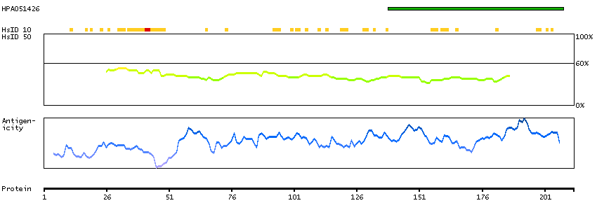 Under the antigens, the maximum percent sequence identity of the protein to all other proteins from other human genes is displayed, using a sliding window of 10 aa residues (HsID 10) or 50 aa residues (HsID 50). The region with the lowest possible identity is always selected for antigen design, with a maximum identity of 60% allowed for designing a single-target antigen (read more).