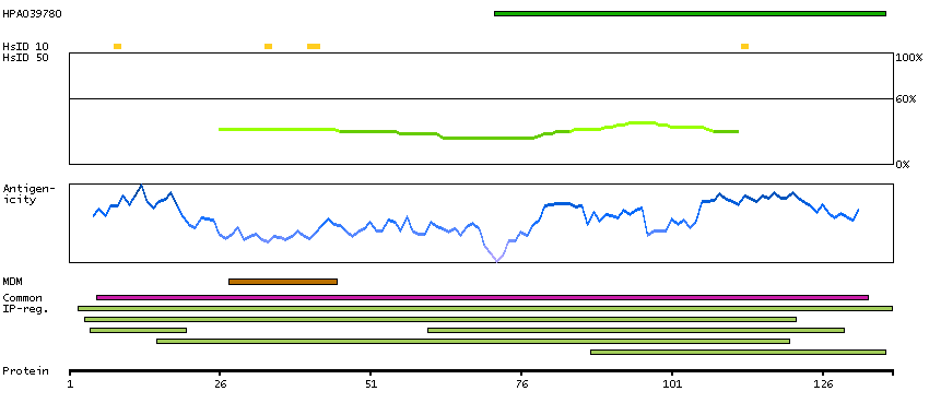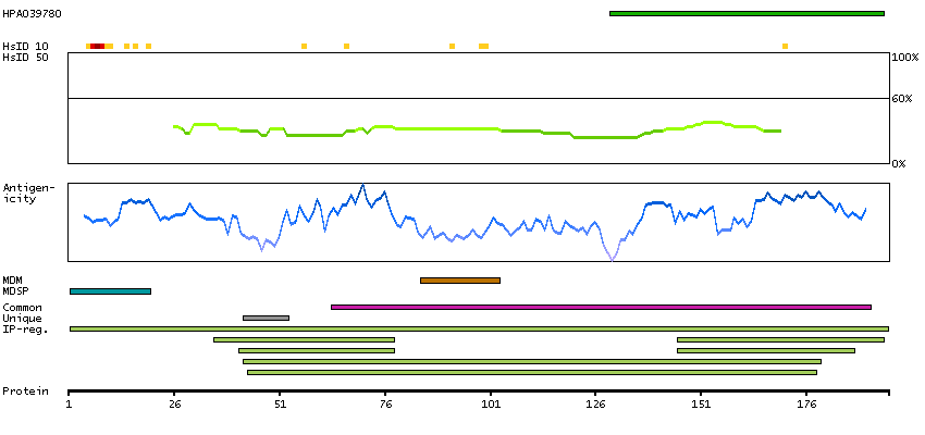 Under the antigens, the maximum percent sequence identity of the protein to all other proteins from other human genes is displayed, using a sliding window of 10 aa residues (HsID 10) or 50 aa residues (HsID 50). The region with the lowest possible identity is always selected for antigen design, with a maximum identity of 60% allowed for designing a single-target antigen (read more).