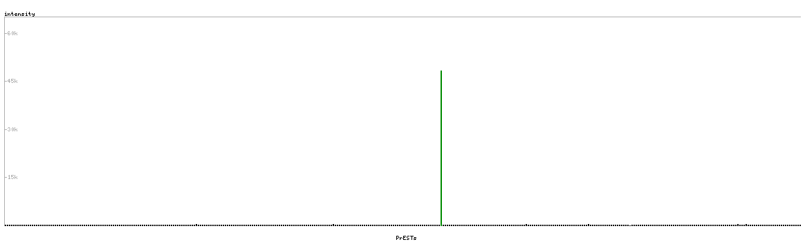 At the top of the view, the position of the antigen (identified by the corresponding HPA identifier) is shown as a green bar. A yellow triangle on the bar indicates a <100% sequence identity to the protein target.