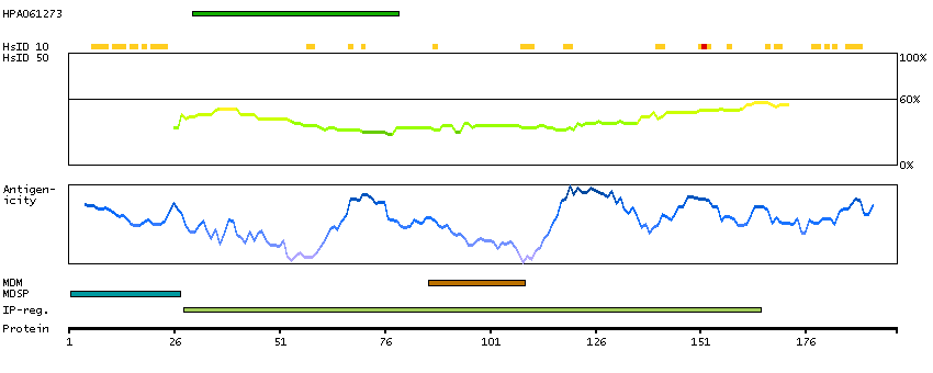 Under the antigens, the maximum percent sequence identity of the protein to all other proteins from other human genes is displayed, using a sliding window of 10 aa residues (HsID 10) or 50 aa residues (HsID 50). The region with the lowest possible identity is always selected for antigen design, with a maximum identity of 60% allowed for designing a single-target antigen (read more).