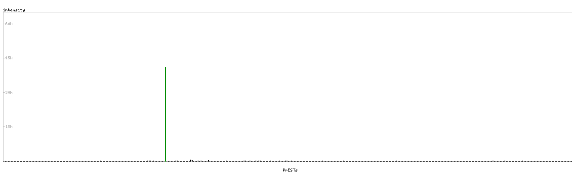 At the top of the view, the position of the antigen (identified by the corresponding HPA identifier) is shown as a green bar. A yellow triangle on the bar indicates a <100% sequence identity to the protein target.