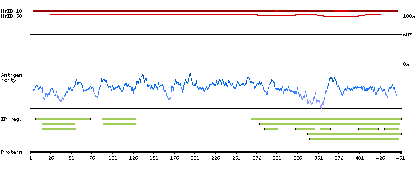 Under the antigens, the maximum percent sequence identity of the protein to all other proteins from other human genes is displayed, using a sliding window of 10 aa residues (HsID 10) or 50 aa residues (HsID 50). The region with the lowest possible identity is always selected for antigen design, with a maximum identity of 60% allowed for designing a single-target antigen (read more).