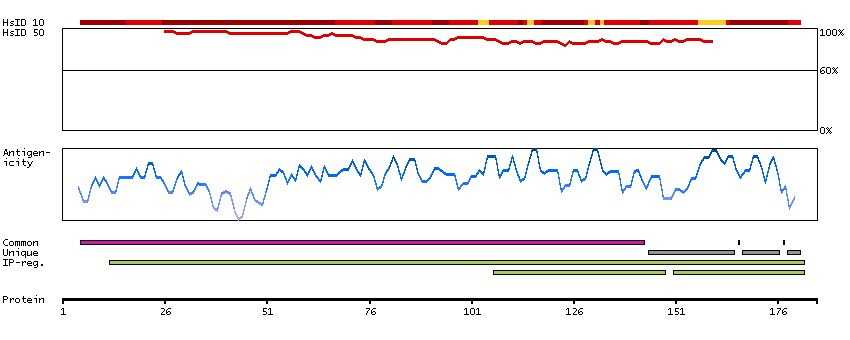 Under the antigens, the maximum percent sequence identity of the protein to all other proteins from other human genes is displayed, using a sliding window of 10 aa residues (HsID 10) or 50 aa residues (HsID 50). The region with the lowest possible identity is always selected for antigen design, with a maximum identity of 60% allowed for designing a single-target antigen (read more).