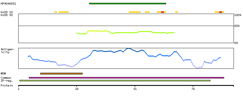 Under the antigens, the maximum percent sequence identity of the protein to all other proteins from other human genes is displayed, using a sliding window of 10 aa residues (HsID 10) or 50 aa residues (HsID 50). The region with the lowest possible identity is always selected for antigen design, with a maximum identity of 60% allowed for designing a single-target antigen (read more).
