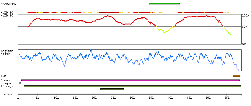 Under the antigens, the maximum percent sequence identity of the protein to all other proteins from other human genes is displayed, using a sliding window of 10 aa residues (HsID 10) or 50 aa residues (HsID 50). The region with the lowest possible identity is always selected for antigen design, with a maximum identity of 60% allowed for designing a single-target antigen (read more).