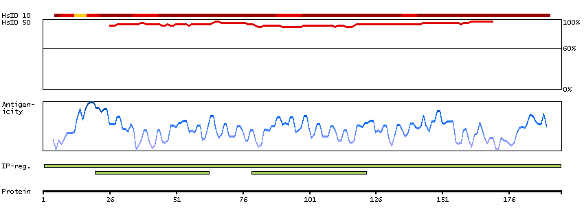 Under the antigens, the maximum percent sequence identity of the protein to all other proteins from other human genes is displayed, using a sliding window of 10 aa residues (HsID 10) or 50 aa residues (HsID 50). The region with the lowest possible identity is always selected for antigen design, with a maximum identity of 60% allowed for designing a single-target antigen (read more).
