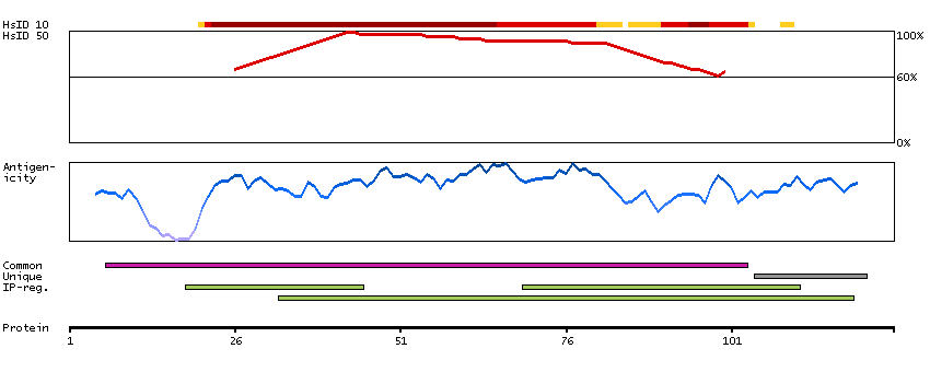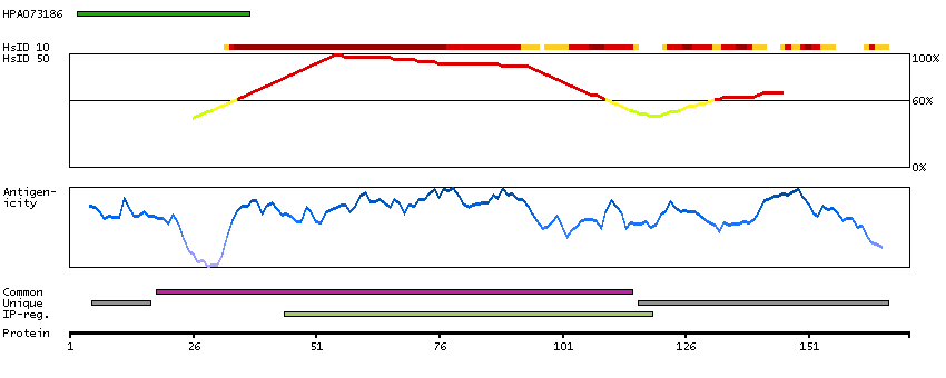 Under the antigens, the maximum percent sequence identity of the protein to all other proteins from other human genes is displayed, using a sliding window of 10 aa residues (HsID 10) or 50 aa residues (HsID 50). The region with the lowest possible identity is always selected for antigen design, with a maximum identity of 60% allowed for designing a single-target antigen (read more).