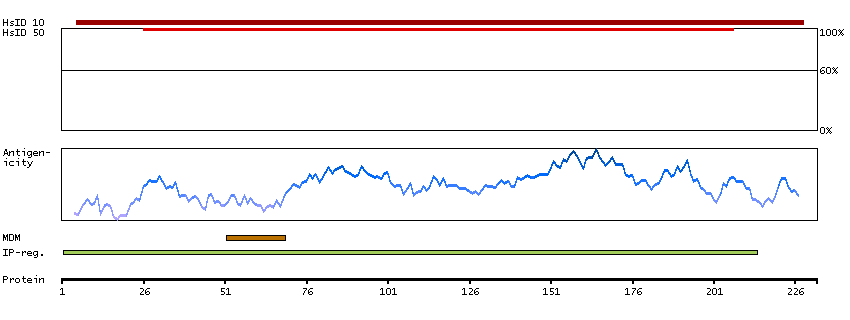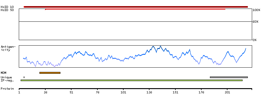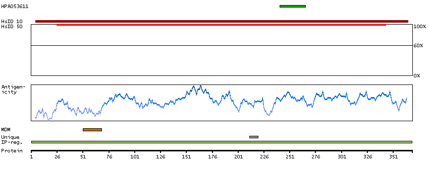 Under the antigens, the maximum percent sequence identity of the protein to all other proteins from other human genes is displayed, using a sliding window of 10 aa residues (HsID 10) or 50 aa residues (HsID 50). The region with the lowest possible identity is always selected for antigen design, with a maximum identity of 60% allowed for designing a single-target antigen (read more).