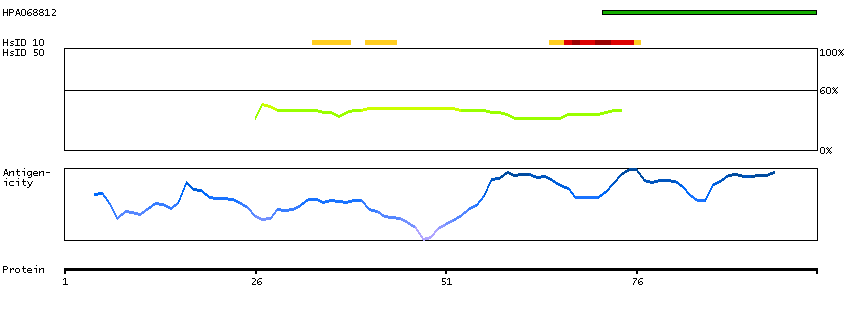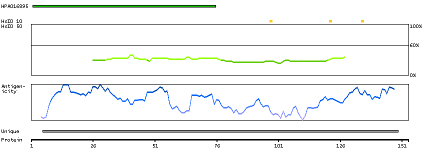 Under the antigens, the maximum percent sequence identity of the protein to all other proteins from other human genes is displayed, using a sliding window of 10 aa residues (HsID 10) or 50 aa residues (HsID 50). The region with the lowest possible identity is always selected for antigen design, with a maximum identity of 60% allowed for designing a single-target antigen (read more).