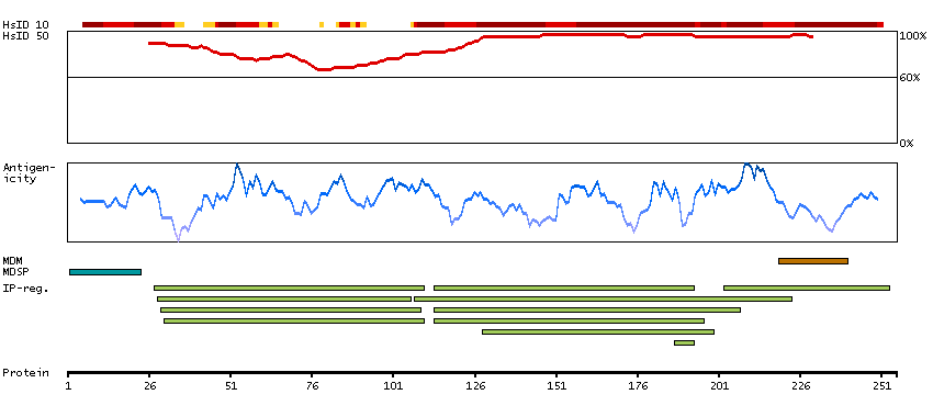 Under the antigens, the maximum percent sequence identity of the protein to all other proteins from other human genes is displayed, using a sliding window of 10 aa residues (HsID 10) or 50 aa residues (HsID 50). The region with the lowest possible identity is always selected for antigen design, with a maximum identity of 60% allowed for designing a single-target antigen (read more).