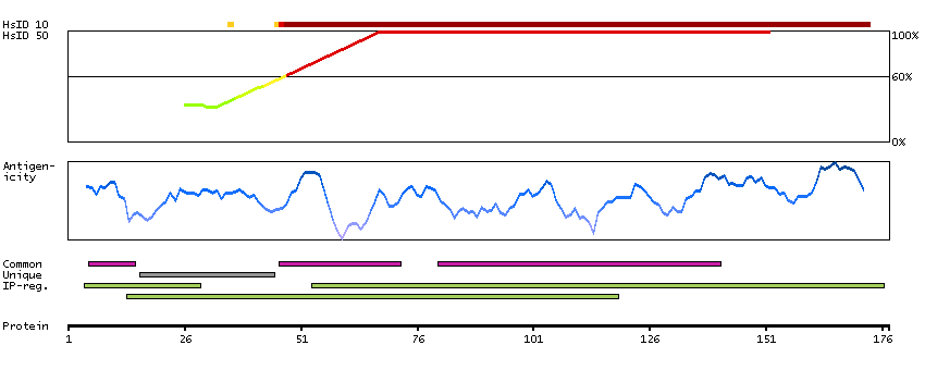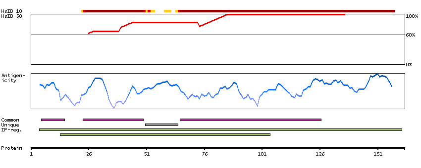 Under the antigens, the maximum percent sequence identity of the protein to all other proteins from other human genes is displayed, using a sliding window of 10 aa residues (HsID 10) or 50 aa residues (HsID 50). The region with the lowest possible identity is always selected for antigen design, with a maximum identity of 60% allowed for designing a single-target antigen (read more).