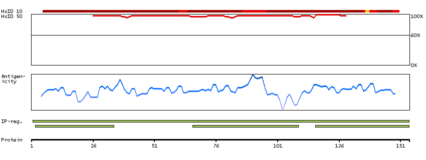 Under the antigens, the maximum percent sequence identity of the protein to all other proteins from other human genes is displayed, using a sliding window of 10 aa residues (HsID 10) or 50 aa residues (HsID 50). The region with the lowest possible identity is always selected for antigen design, with a maximum identity of 60% allowed for designing a single-target antigen (read more).