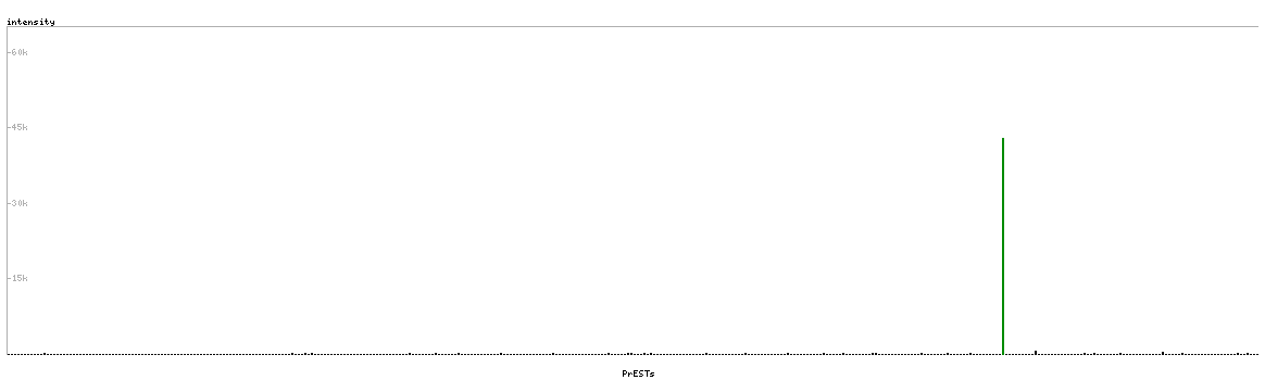 At the top of the view, the position of the antigen (identified by the corresponding HPA identifier) is shown as a green bar. A yellow triangle on the bar indicates a <100% sequence identity to the protein target.