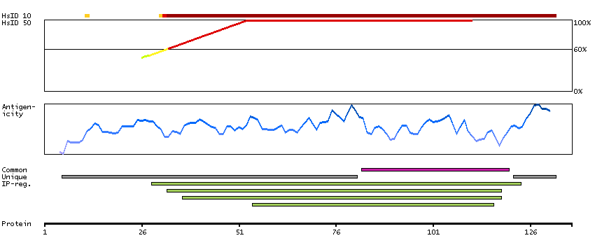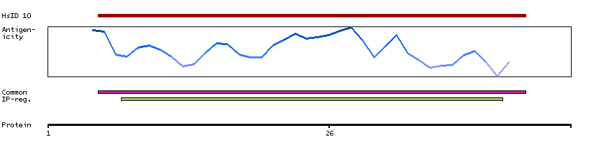 Under the antigens, the maximum percent sequence identity of the protein to all other proteins from other human genes is displayed, using a sliding window of 10 aa residues (HsID 10) or 50 aa residues (HsID 50). The region with the lowest possible identity is always selected for antigen design, with a maximum identity of 60% allowed for designing a single-target antigen (read more).