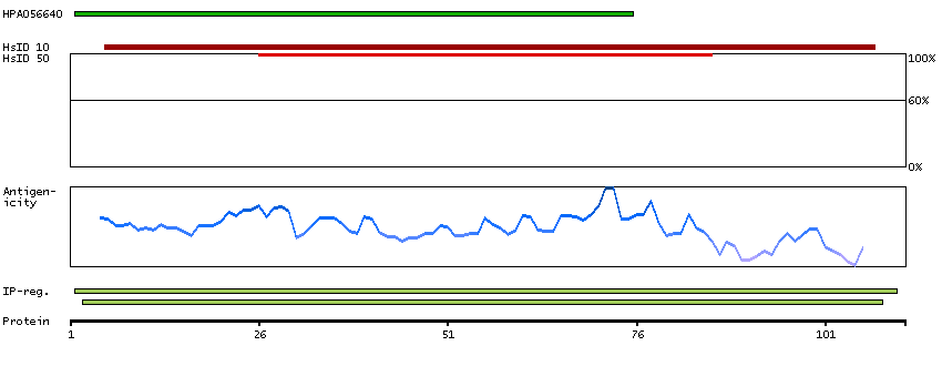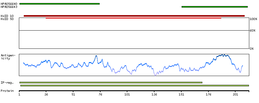Under the antigens, the maximum percent sequence identity of the protein to all other proteins from other human genes is displayed, using a sliding window of 10 aa residues (HsID 10) or 50 aa residues (HsID 50). The region with the lowest possible identity is always selected for antigen design, with a maximum identity of 60% allowed for designing a single-target antigen (read more).